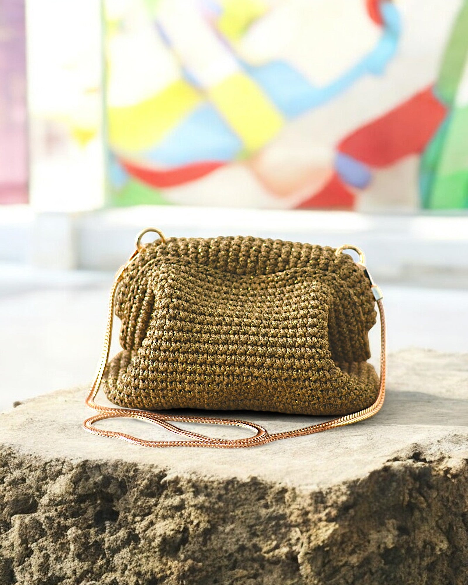 Bolso scrunch Copenhague Dorado FW25/26 tejido artesanal en lana y polipropileno reciclado con cadena extraíble y acabado brillante