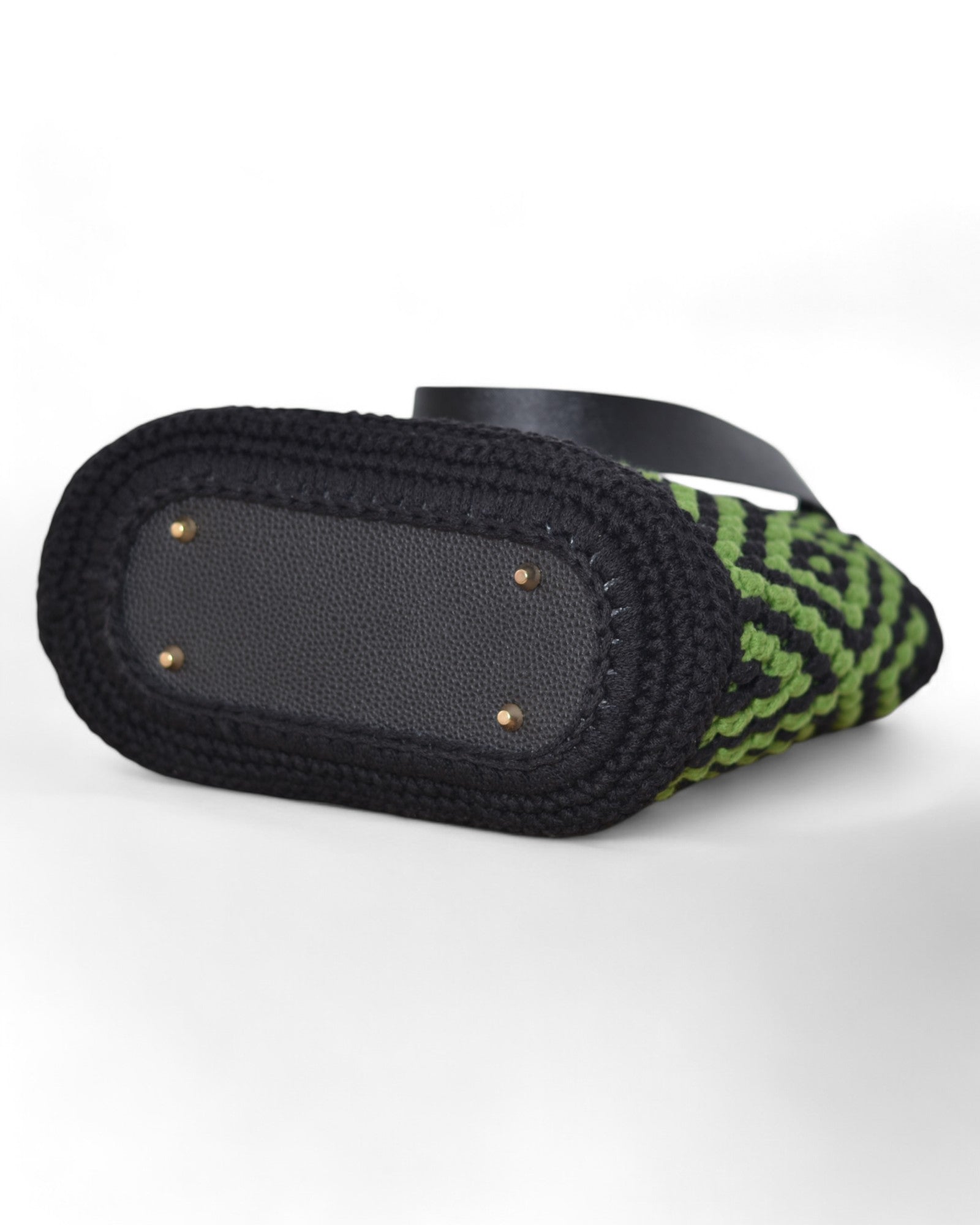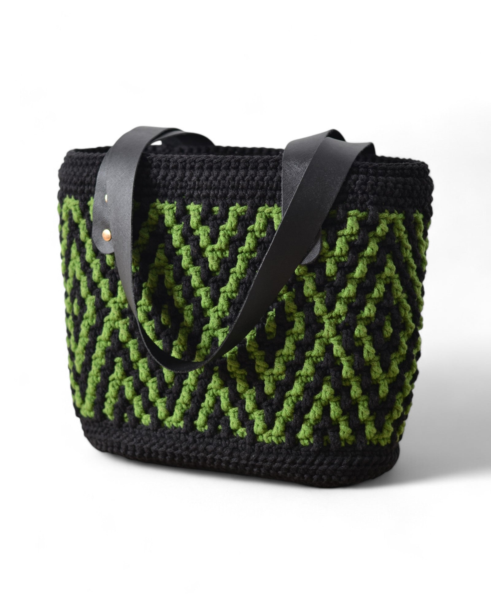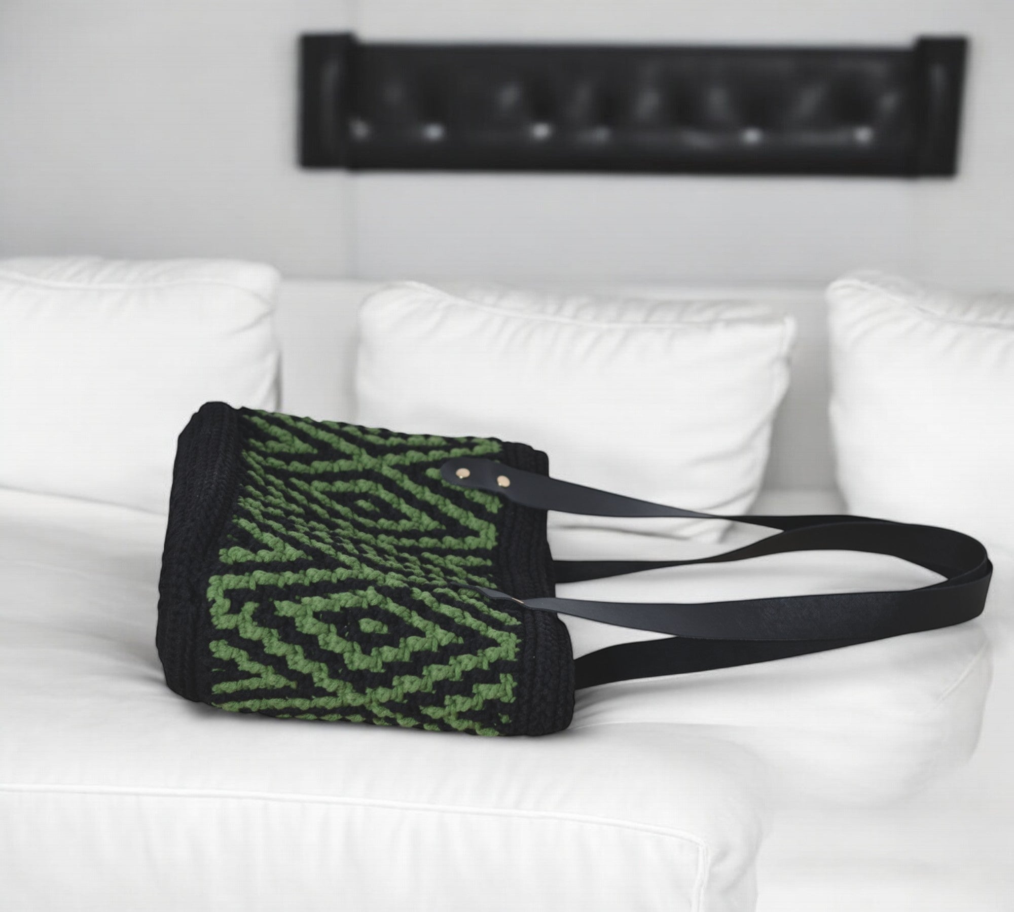 Bolso Tote Bag Mosaico en Crochet Verde y Negro con Asas de Cuero Genuino