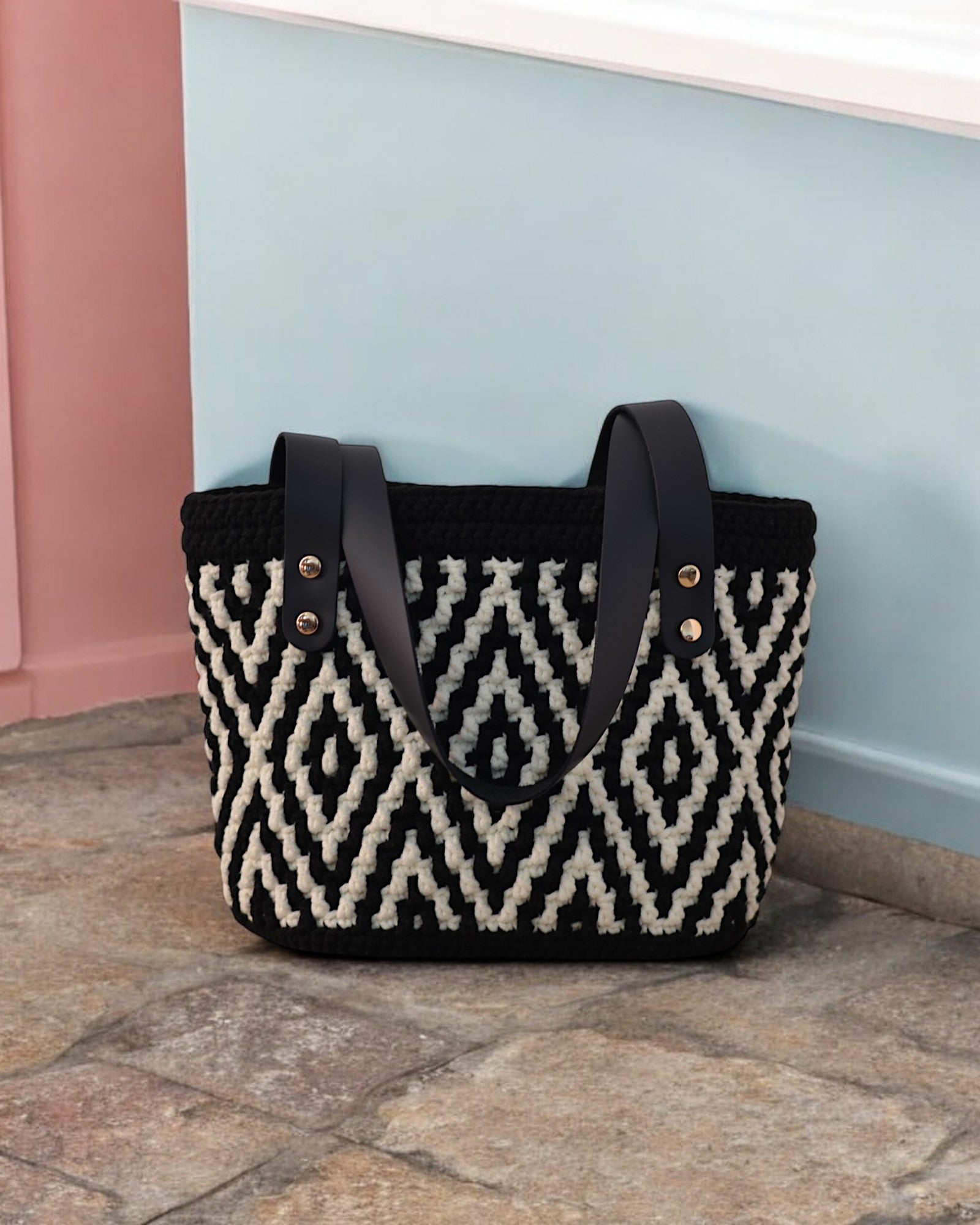 Elegante Bolso Tote Bag de Mosaico en Crochet, tejido a mano con hilo de algodón grueso de la más alta calidad.